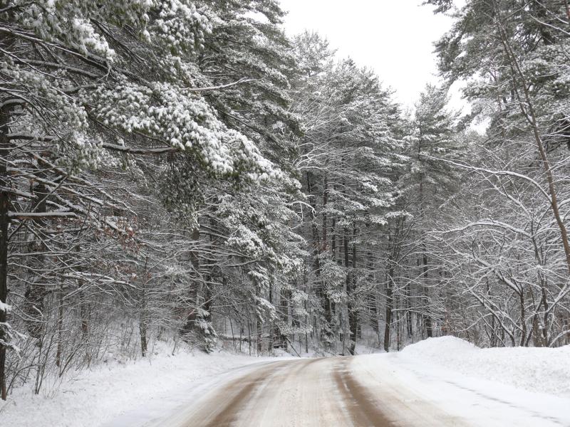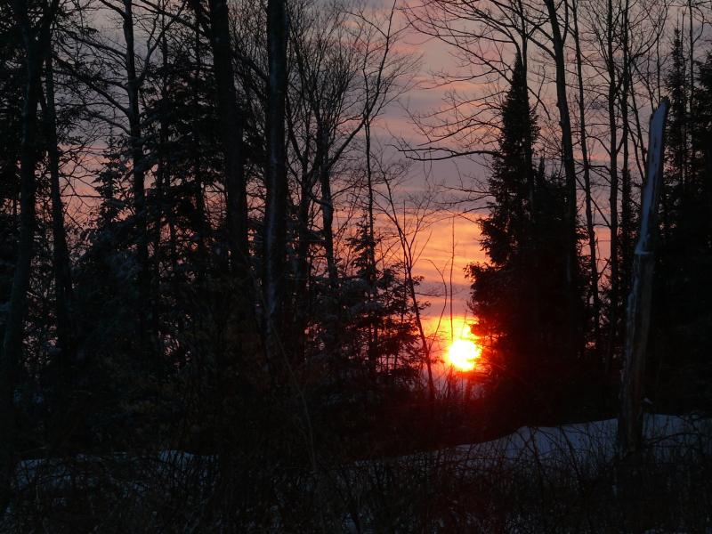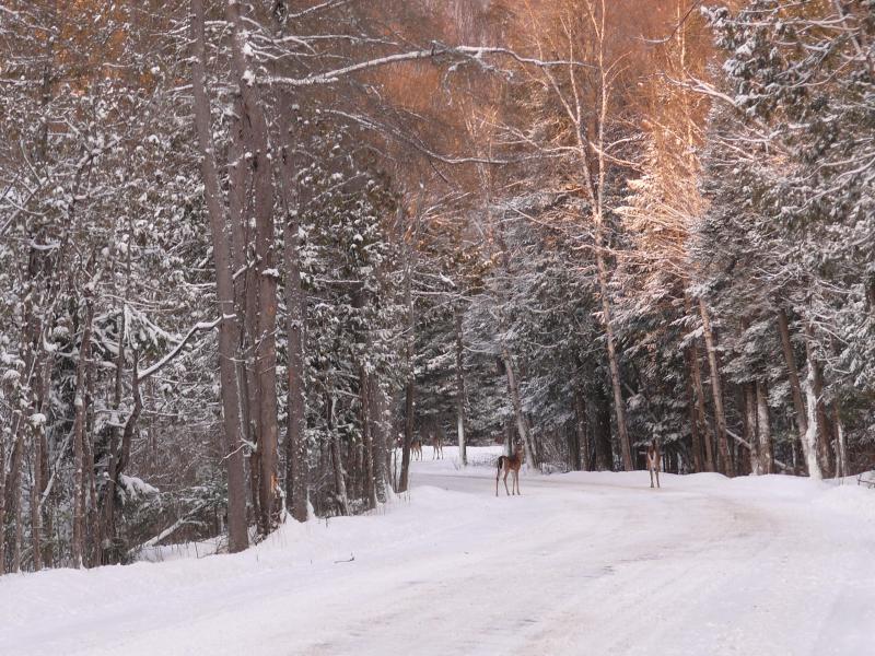 En fin d’après midi, la tempête s’apaise. Un timide rayon de soleil perce les nuages. Nous sautons dans la Buick et nous partons sur une piste forestière faire quelques photos de nature enneigée et du coucher de soleil qui s’annonce magnifique