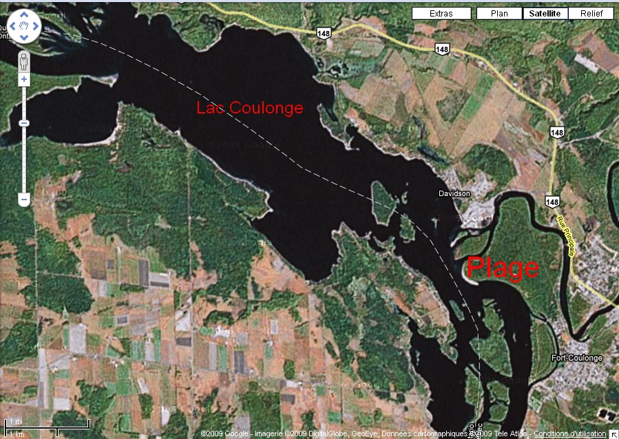 Le lac Coulonge, un élargissement naturel de la rivière des Outaouais situé entre Fort-Coulonge et Waltham. Il fait 19 km de long par un peu plus de 2 km de large et une superficie approximative de 25 km2.