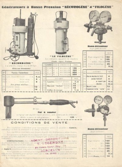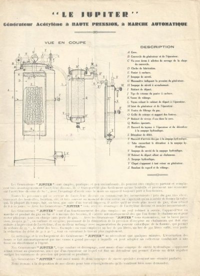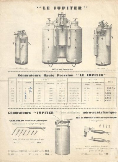 On y voit la gamme de chalumeaux G. V., les Lucifer, les Jupiter, les générateurs à acétylène Jupiter et Sécurogène, Filogène.