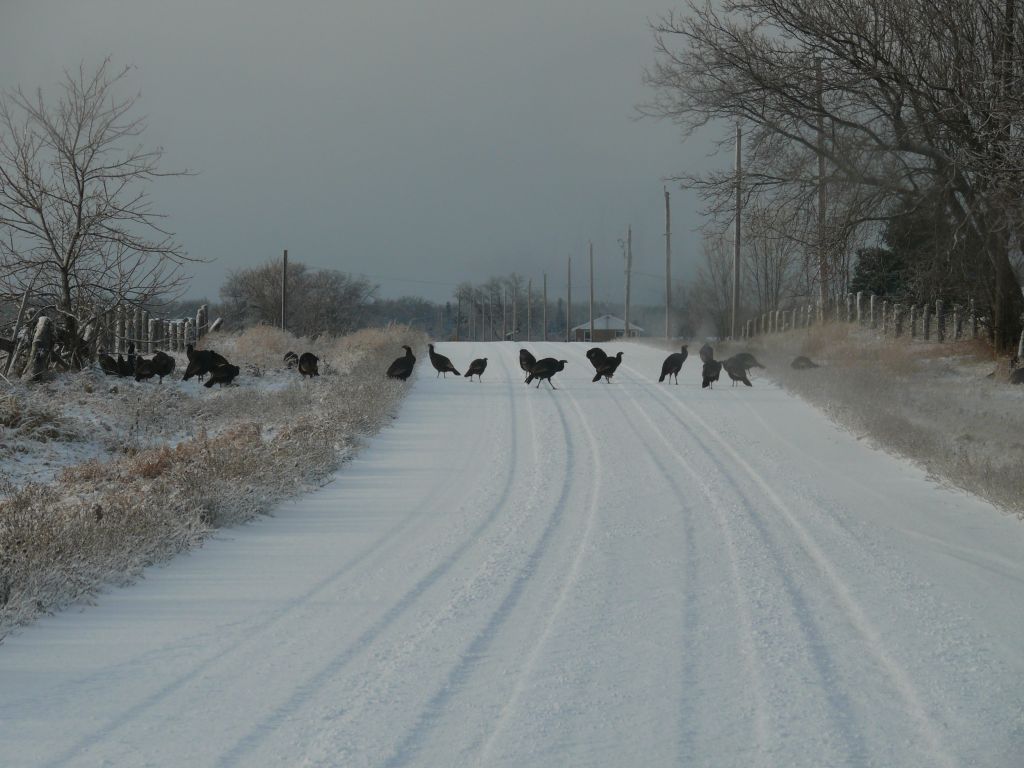 Un troupeau de dindon, au moins 35 individus, traverse la route devant moi, sans se presser.