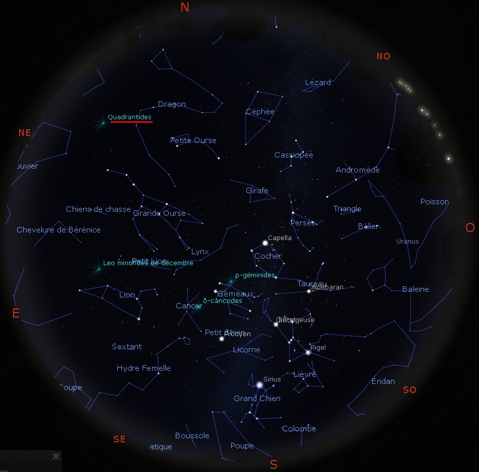 Le maximum d’intensité sera dans la nuit du 3 au 4 janvier, cependant quelques étoiles filantes seront visibles durant les nuits du 1 au 5 janvier.