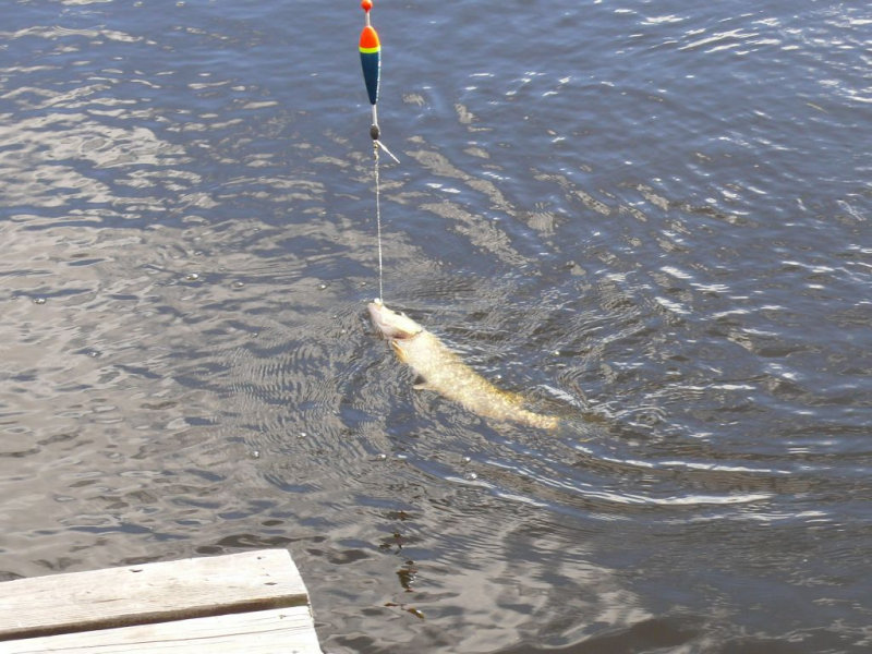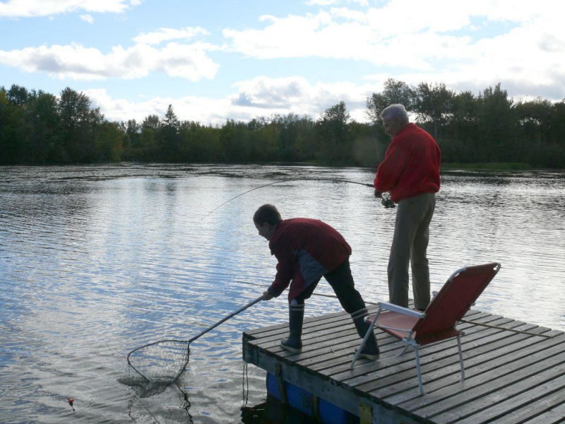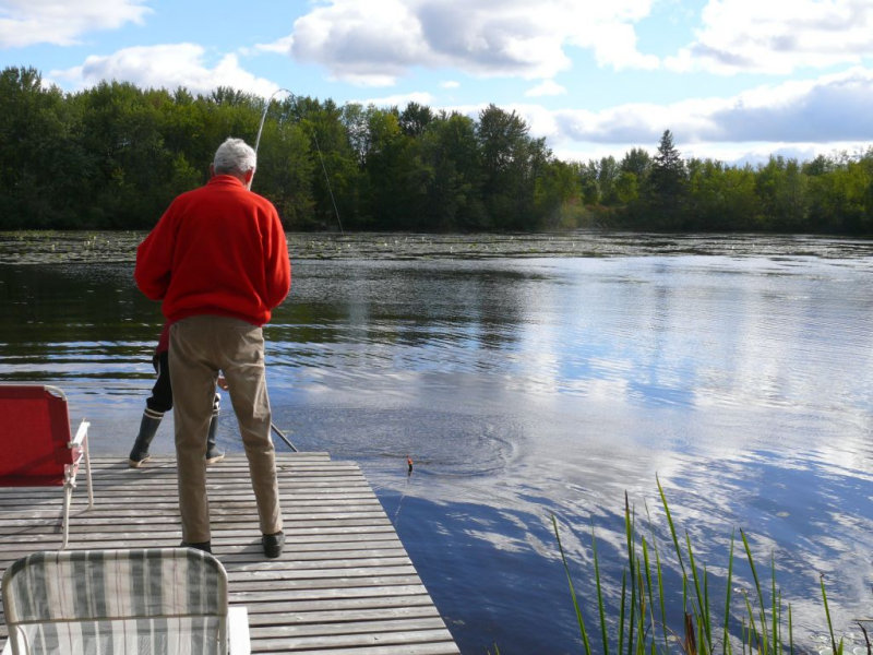 Partie de pêche au brochet au vif sur le quai de la résidence de tourisme du Val à l’âne dans la rivière des Outaouais en mi-septembre.