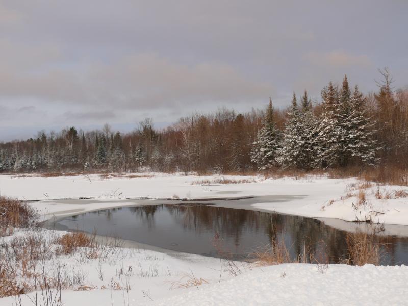 En fin d’après midi, la tempête s’apaise. Un timide rayon de soleil perce les nuages. Nous sautons dans la Buick et nous partons sur une piste forestière faire quelques photos de nature enneigée et du coucher de soleil qui s’annonce magnifique