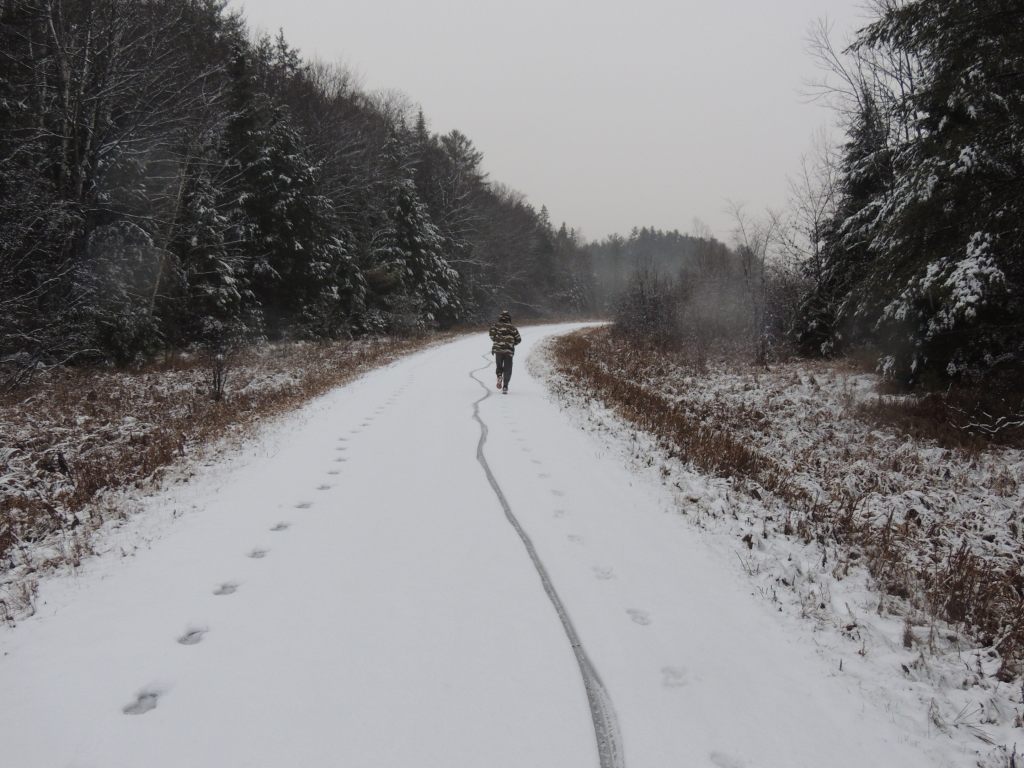 On rentre tranquillement, je pousse mon vélo, à pied dans la dernière côte. Même si la neige n’est pas épaisse, elle est lourde et pédaler dans la neige immaculée m’a demandé bien plus d’efforts que d’habitude. Je suis crevé.