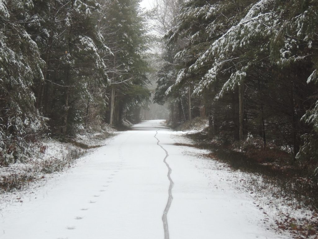 La neige cesse à peine parti, il pleut, mes mains gèlent, mes orteils claquent des dents... La piste ces dernières semaines a gelée, dégelée, été détrempée, quelques rares vélos y ont laissés des empreintes dans le sol mou qui a regelé. On les devine sous le mince manteau de neige. Les trous, les ornières faites par des motos, des quads sont un peu plus visibles et ont failli me faire chuter plusieurs fois.