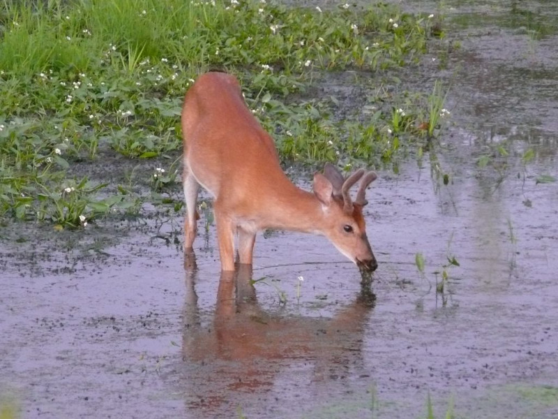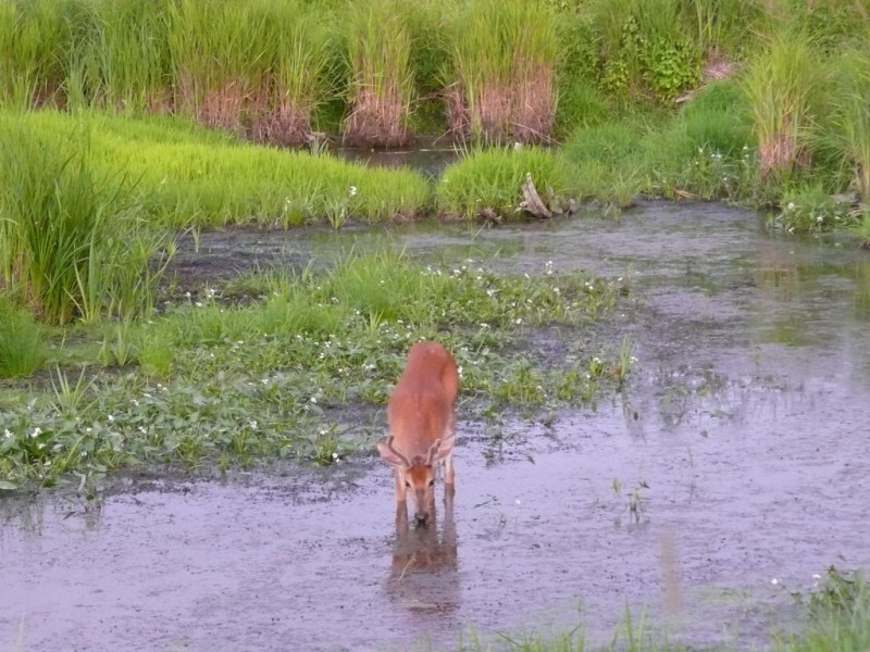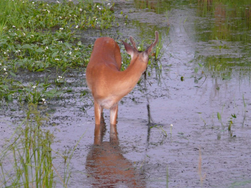 Cerf du Virginie qui broute des plantes aquatiques dans un petit ruisseau à 5 min à pied du Val à l’âne.