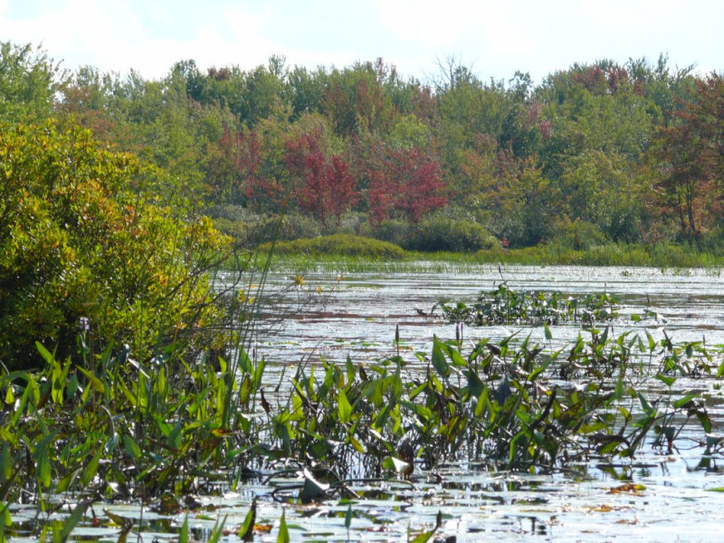 L’après-midi, on part faire une balade à pied. là tout à changé. Il fait plus chaud, 14 degrés, pas de vent, du soleil par moment. On marche, tout est encore bien vert mais certains arbres commencent à changer de couleur. On voit un canard en 3 km de marche. rien d’autre ! Juste quelques petits oiseaux farouches. Puis soudain, un cris, des mouvements, on voit un écureuil roux sur un chêne à quelques mètres. Un acrobate qui saute avec agilité de branches en branches. Il fait des pauses, se gratte, grignote, change de position.. On devine de suite la vedette habituée à poser devant les photographes... puis d’un bond, il disparait. Le kilomètre suivant, on a vu pas mal de tamias puis plus rien de nouveau !
