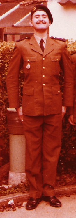 À peine arrivé à la caserne et avant d’avoir le temps de réaliser ce qui se passe, je me retrouve en uniforme et avec le crâne rasé. Heureusement, après maintes ruses et un premier conflit avec mes supérieurs, j’arrive après un savant stratagème à passer à la photo avec mes bacchantes à la tartare ce qui les a sauvés d’une fin certaine. Du moment qu’elles étaient sur ma carte d’identité militaire, elles devenaient intouchables. J’ai donc dû assumer le fait d’être le seul moustachu de la caserne, ce qui me donnait une certaine individualité, chose très mal vue. Heureusement, mon chef de section était un vieux baroudeur qui avait fait toutes les guerres et qui avait la qualité essentielle et unique d’être barbu ! Le seul barbu que j’ai vu dans l’infanterie de marine ! Ses nombreuses médailles lui octroyaient certainement ce rare privilège. Il prit donc sous sa protection mes moustaches et lorsque je refusais la place de dactylo que l’on m’imposait alors que je voulais devenir GV, c’est à dire, grenadier voltigeur, il fit pression sur la hiérarchie.