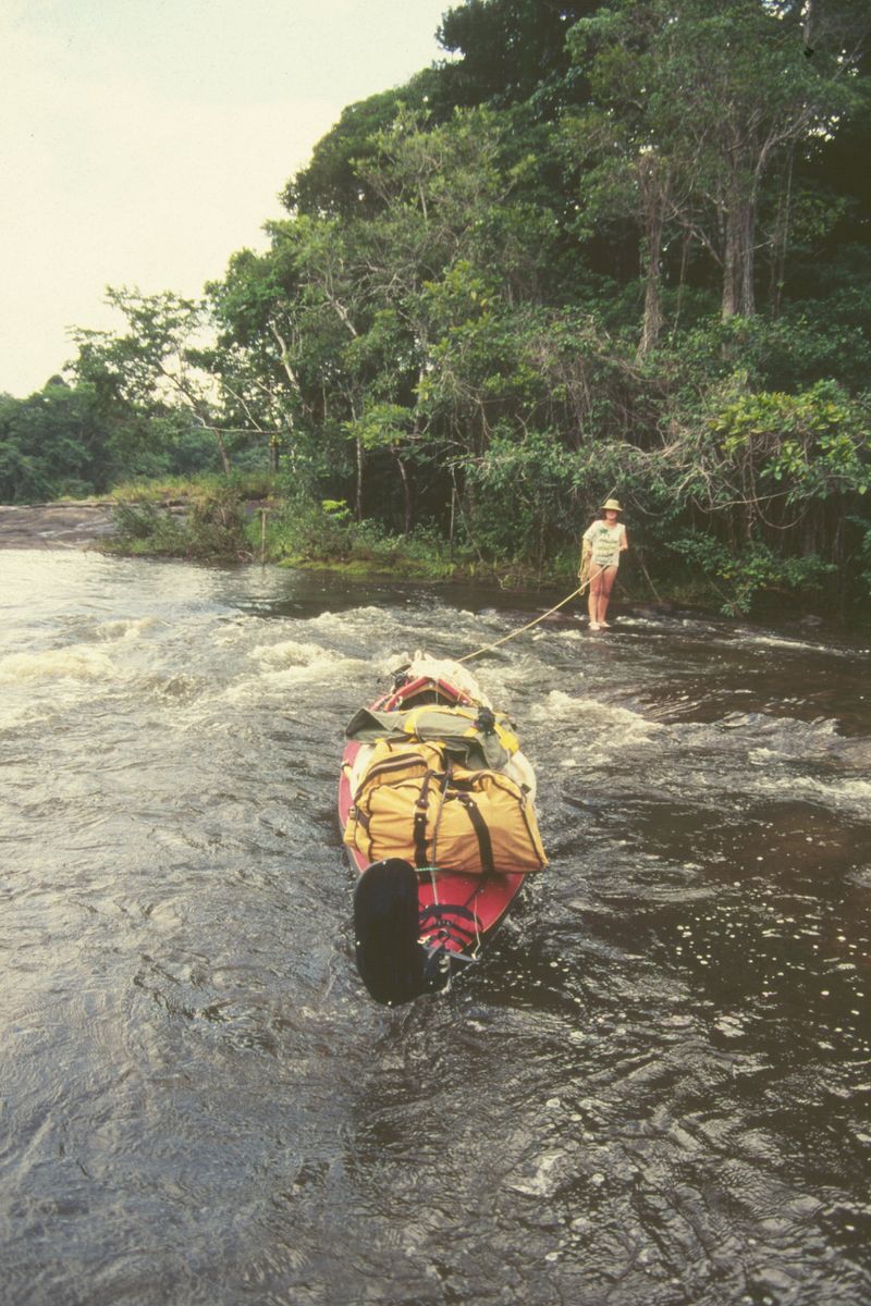 Le kayak d’expédition est lourdement chargé, le courant très fort. Le rapide est dangereux. Le seul endroit sécuritaire trouvé pour le franchir est un « bistouri », un petit canal naturel. Ce jour la , ça c’est mal passé. Les roches étaient glissantes, le courant était violent dans le bistouri qui s’élargissait par endroits. Le kayak s’est mis en travers, a entraîné Momo qui a été traînée sur des roches abrasives et il a redescendu le rapide, avec nous qui courrions derrière.... On a récupéré le kayak. Tout le chargement était bien attaché, on n’a rien perdu.