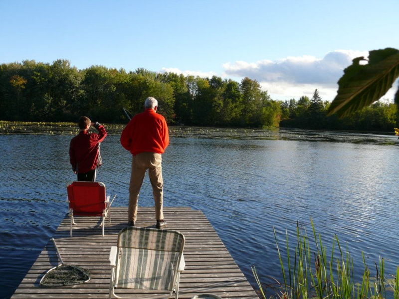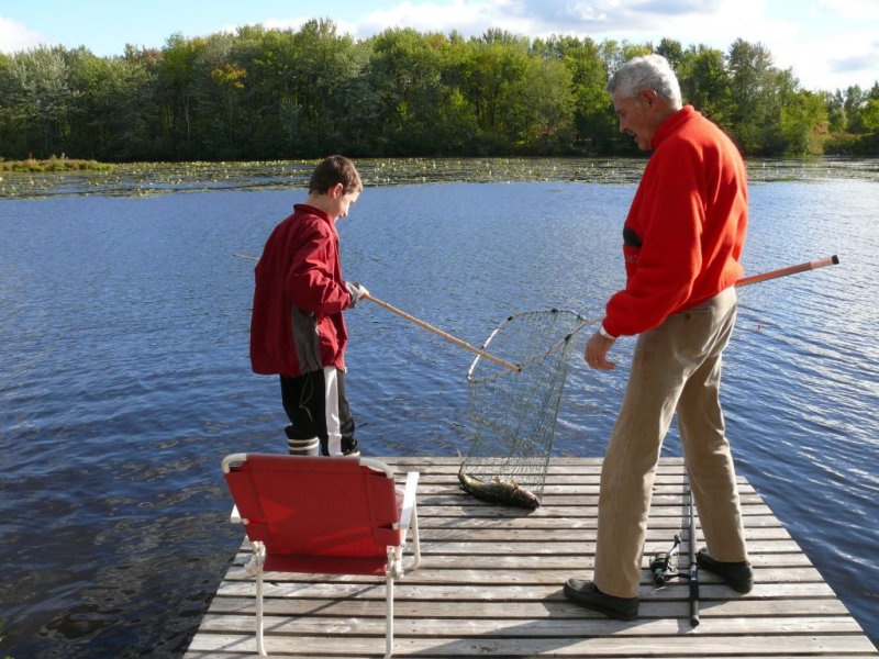 Partie de pêche au brochet au vif sur le quai de la résidence de tourisme du Val à l’âne dans la rivière des Outaouais en mi-septembre.