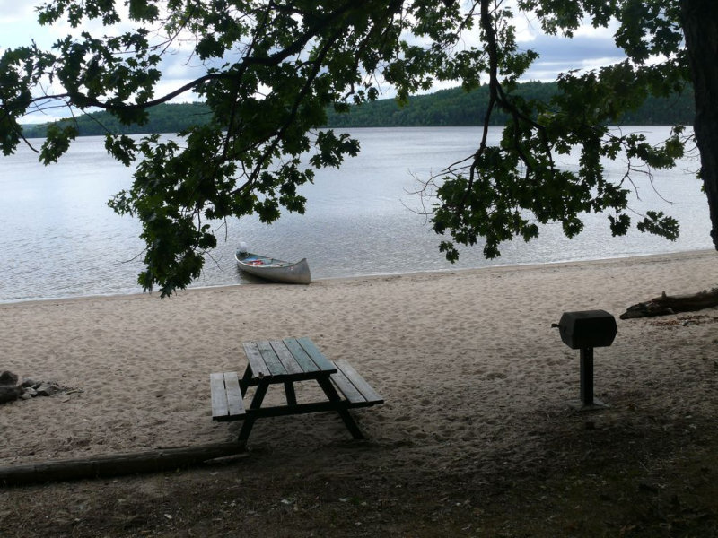 On aperçoit la plage et derrière le promontoire, le haut du rocher de l’oiseau. En été la plage est très fréquentée. Elle est propre et bien aménagée. On y trouve des tables de pique nique, bbq a charbon de bois, des toilettes, des poubelles anti ours.