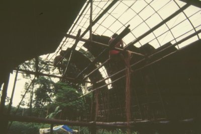 Construction d’une oka traditionnelle Oyampi à Trois-Sauts, à l’extrême sud de la Guyane, sur l’Oyapock. Dessin fait à la gouache.