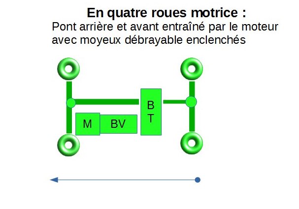 La transmission 4 roues motrices et les rapports courts doivent être engagés par le conducteur [rouge]lorsque les conditions le nécessitent [fond jaune]uniquement[/fond jaune][/rouge]. On voit trop souvent des conducteur qui se mettent systématiquement en 4x4 des qu’ils arrivent sur des chemins de terre alors que cela n’est pas nécessaire, imposant de lourdes contraintes inutiles à la boite de transfert.
